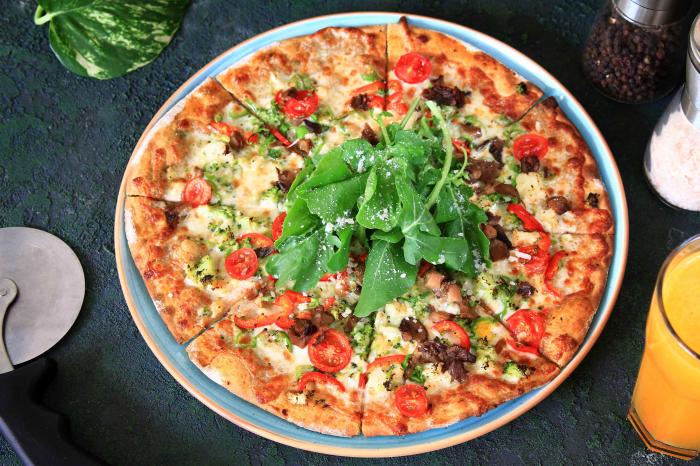 Mozerella peyniri, mantar, domates, zeytin dilimleri, kapya biber, brokoli ve taze roka ile …