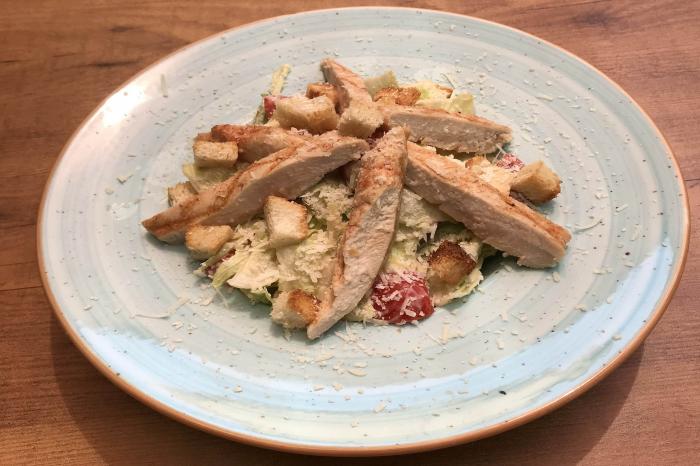 Organik ızgara tavuk bonfile, kruton ekmek, çeri domates, aysberg marul ve sezar sos ile ..