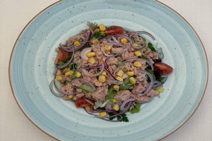 Akdeniz yeşillikleri üzerine çeri domates, salatalık ve ton balığı ile ..