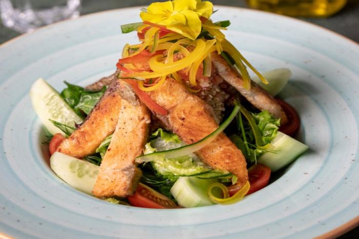 Akdeniz yeşillikleri üzerine çeri domates, salatalık, Organik Kinoa ve fırınlanmış Somon dilimleri ile ..
