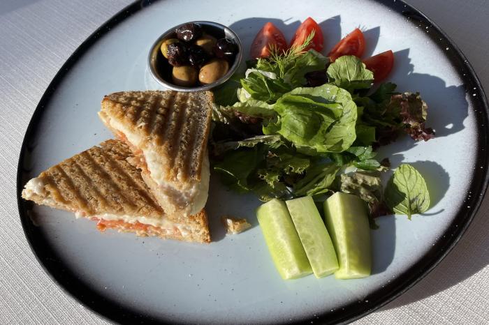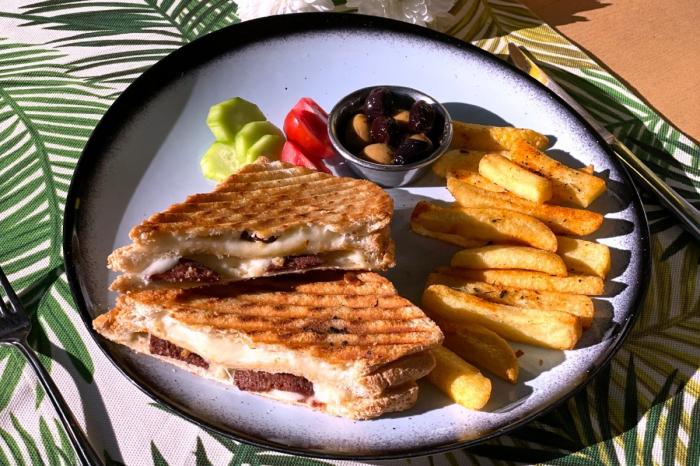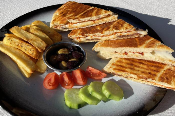 Ayvalık ekmeğinde taze kaşar, patates cipsi siyah & yeşil zeytin ve söğüş ile...
